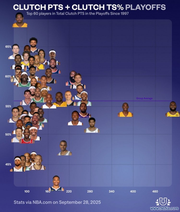 97年以来季后赛关键积分 前60人:詹姆斯总积分 第一 霍里效率第一