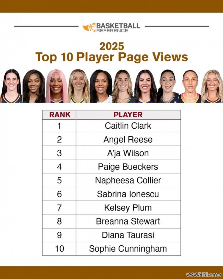 数据网站公布本赛季WNBA球员浏览量排行:克拉克第1 阿贾第3