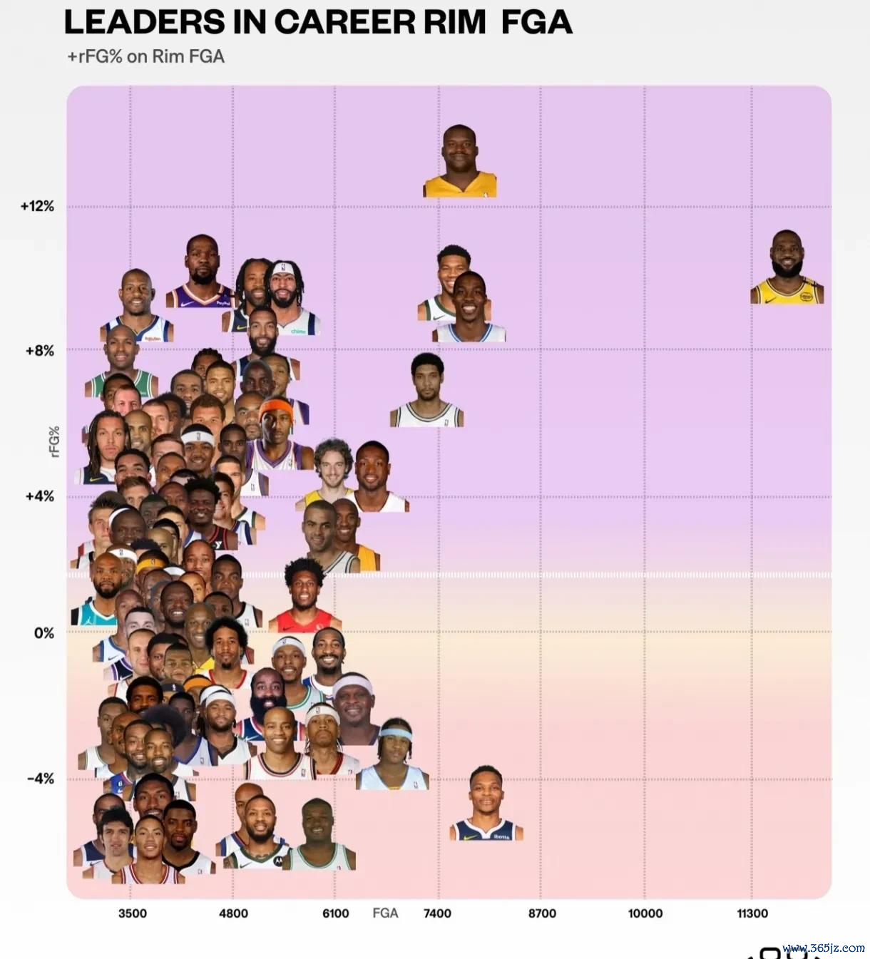 而同时,NBA统计了NBA历史上的100大攻框手,看到这张图,说明了一切,纵轴表示积分 效率,横轴表示攻框次数,可以看出,奥尼尔不愧是NBA历史上篮下统治力最强的球员,而詹姆斯作为小前场球员,游泳快讯他的攻框效率比霍华德, 国际米兰字母哥, 排球资讯浓眉等人都要高,除了奥尼尔,詹姆斯篮下攻框效率最强。