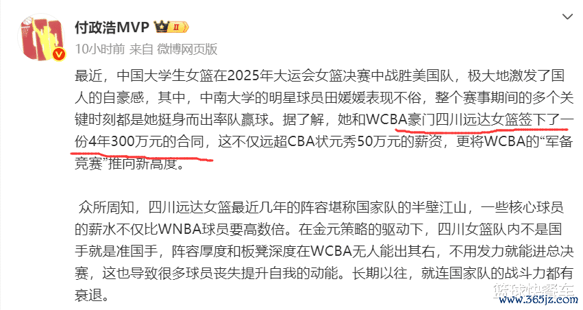 像WNBA这种世界第一职业联赛 ,球员的平均年薪也只是勉强达到10万美元,而新人的年薪就更加少得可怜了,即便是作为WNBA的状元秀,他们第一年的年薪也不足8万美元。如果按照这个计算的话,WNBA状元秀的年薪其实只有不到60万元。而田媛媛呢?在与四川队签下四年300万合同后,这也就意味着,她的平均年薪已经达到75万元,已经超过了WNBA状元秀的年薪了。