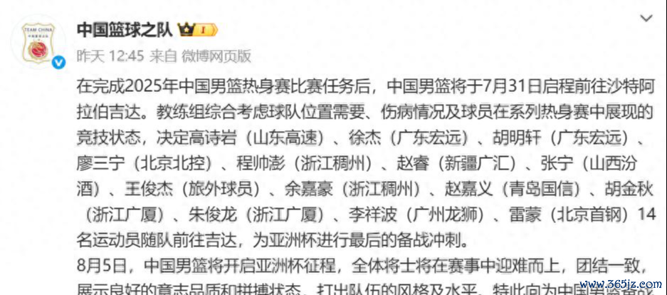 FIBA亚洲官网非最终名单, 传徐杰暂未落选, 两天后中国男篮名单揭晓