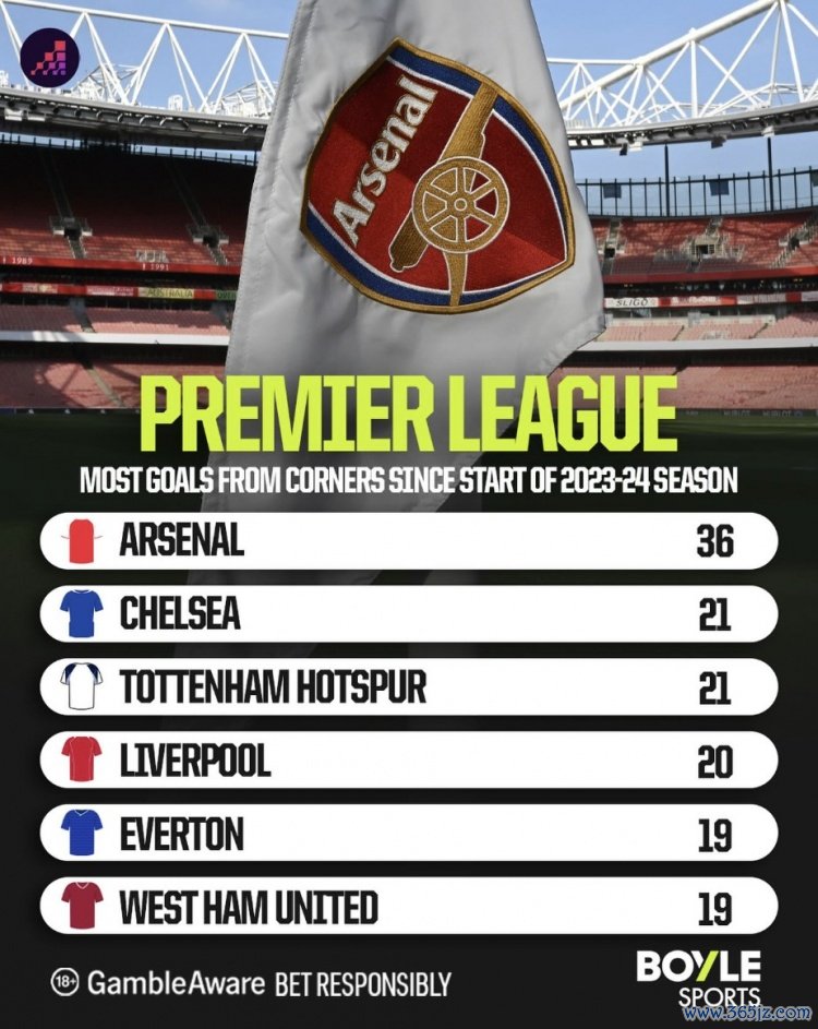 23-24赛季以来英超底线球得分 最多:枪手36球断崖领跑 ,蓝军21球第2