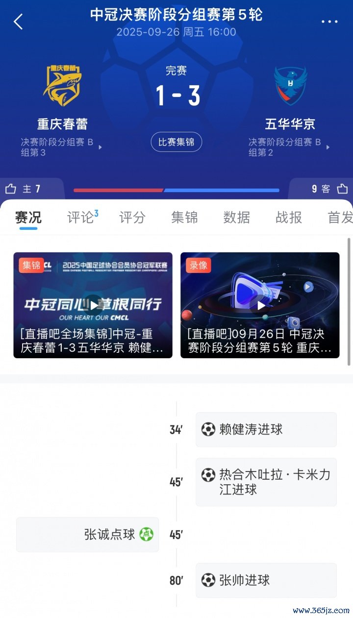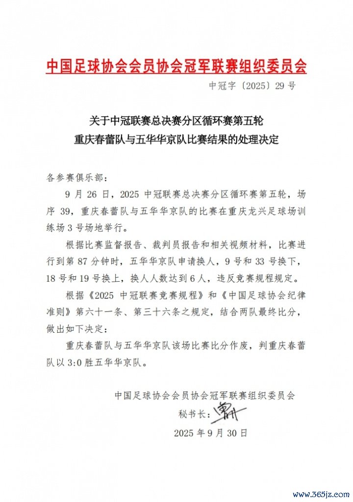 09月30日讯 中冠总决赛 阶段分组赛第5轮,重庆春蕾1-3不敌五华华京。中国古代足球 协会会员协会第一名 职业联赛 组织委员会发布公告,由于五华华京队替换队员 人数达到六人,违反竞赛规程规定,该场赛事 五华华京被判0-3负。