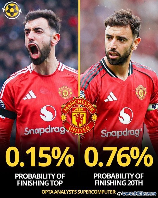 Opta超算预测,本赛季曼联英超垫底概率0.76%,大于夺魁 概率0.15%