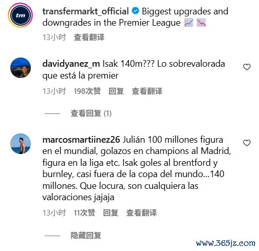 球迷B:“阿尔瓦雷斯在世界杯赛 上表现亮眼,欧冠踢皇马打入世界波,西甲职业联赛 中也是关键球员, 排球资讯现在身价1亿。伊萨克靠踢伯恩利和布伦特福德得分 ,游泳快讯差点进不了世界杯赛 ……身价是1.4亿。真是太疯狂了, 国际米兰高清直播这些身价真是随便给的,哈哈哈哈。”