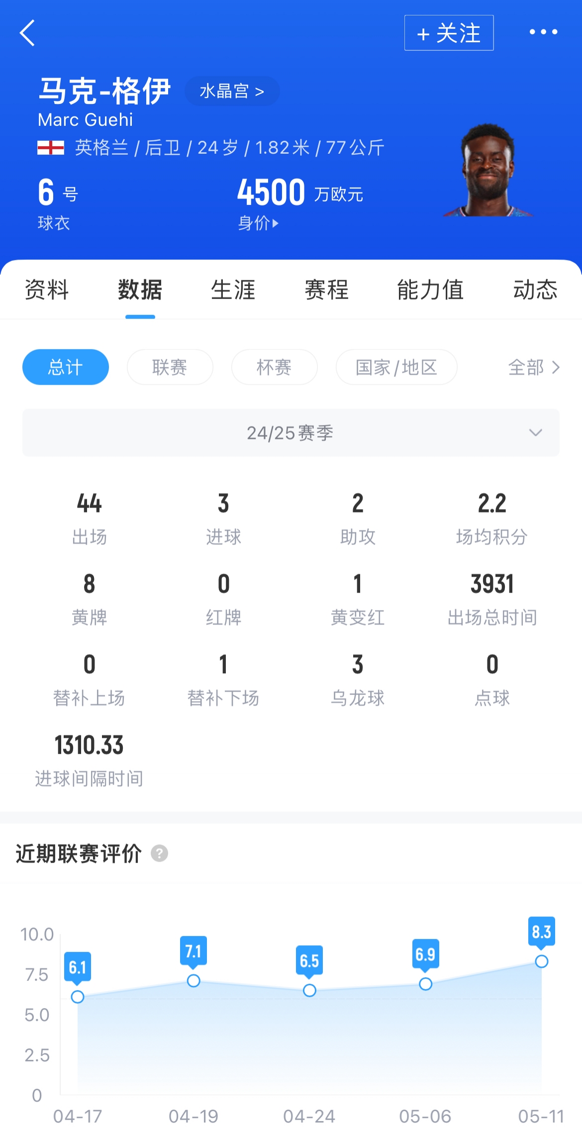 格伊已为英格兰国家队出场23次,并肯定将入选明年世界杯赛 的阵形 名单。上赛季,他为水晶宫出场44场,取得3粒得分 和2次助功 ,目前其德回转 价为4500万欧元。