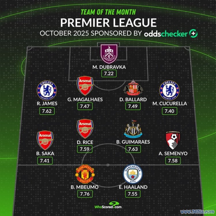 WhoScored英超十月最佳阵:哈兰德锋线搭姆伯莫,枪手3人蓝军2人