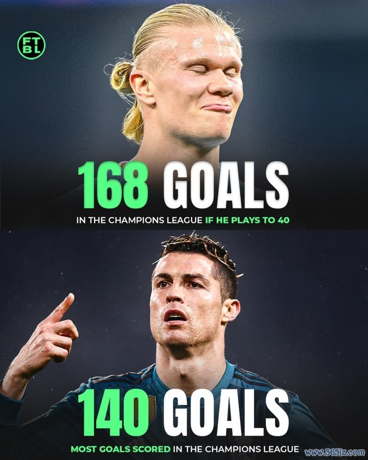 🤯再踢10年超过C罗?AI预测:哈兰德40岁时欧冠总得分 168粒