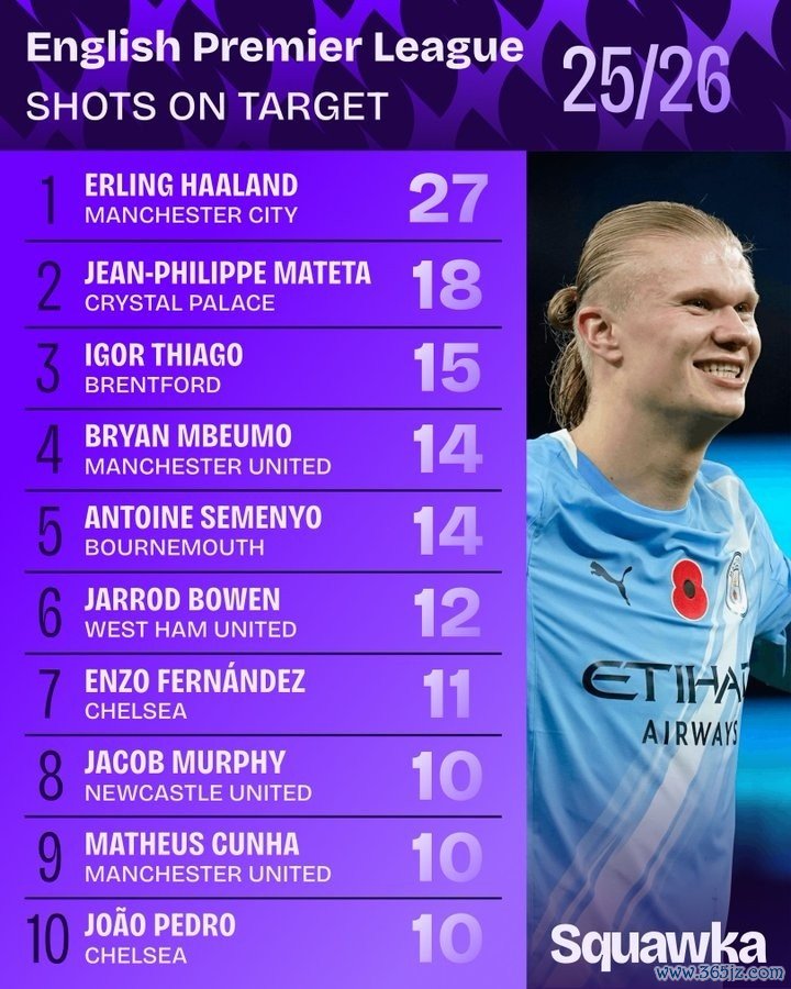 本赛季英超射正榜:哈兰德27次领跑,姆伯莫、恩佐、佩德罗在列