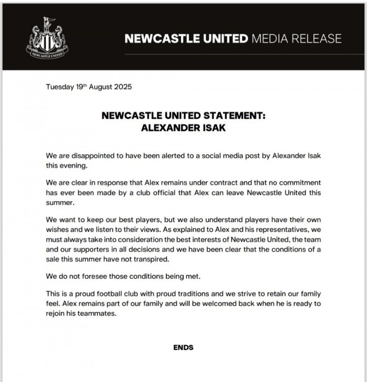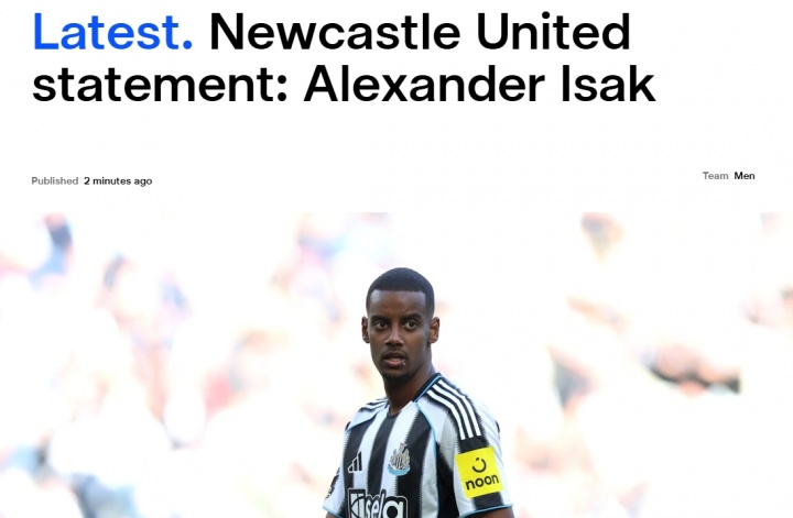 08月20日讯 伊萨克今日在社媒发文,指责纽卡违背承诺,纽卡斯尔联官方刚刚发文回应,表示从未承诺伊萨克今夏可以离队。